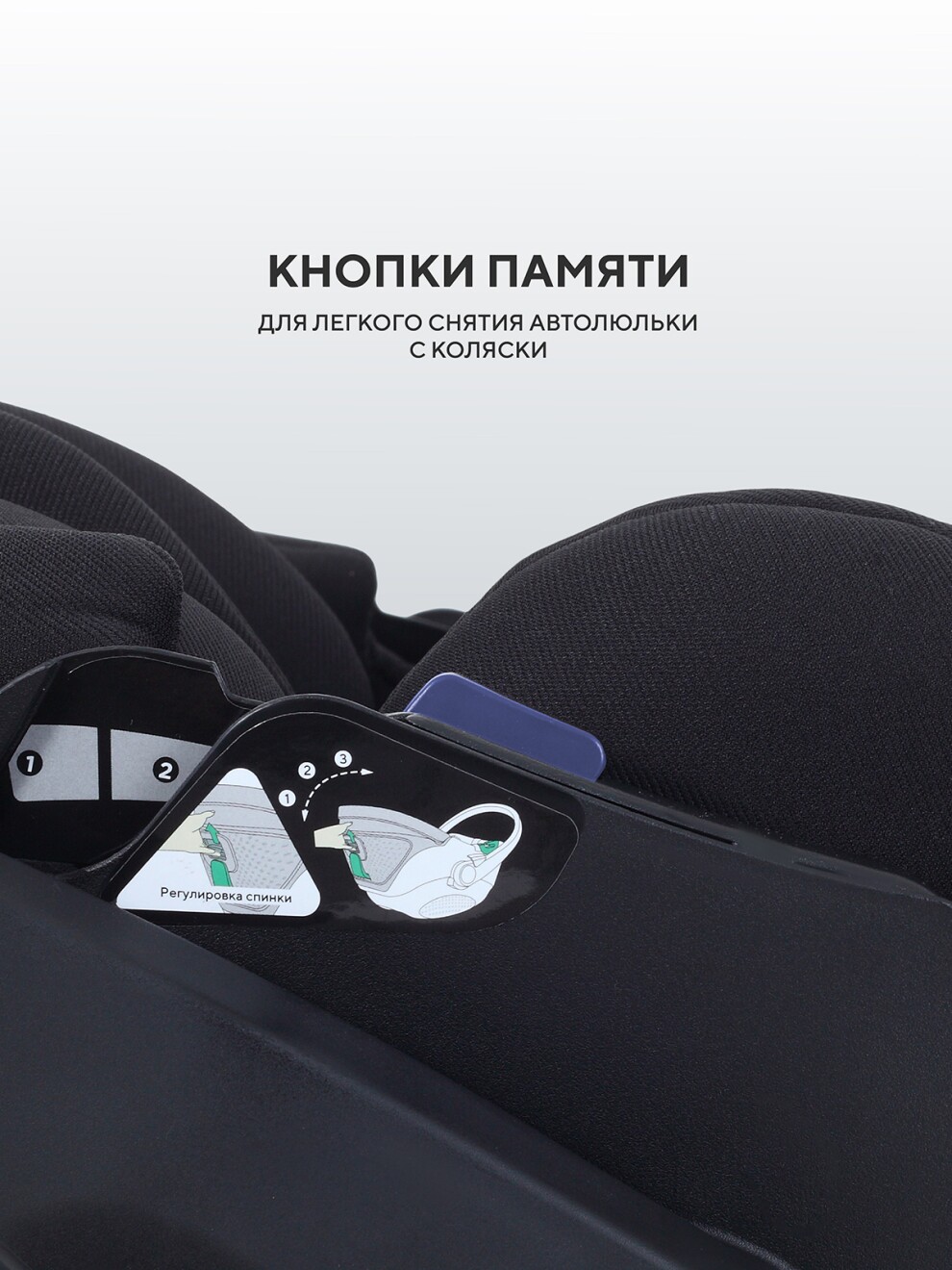 • автолюльку можно закрепить на базе коляски с помощью адаптеров . Благодаря инновационным кнопкам памяти автолюльку можно снять с базы коляски одной рукой.