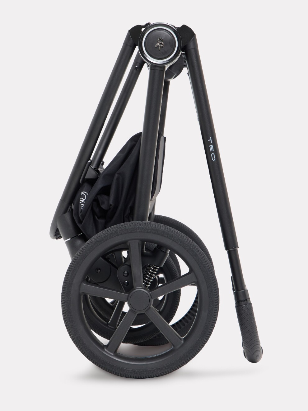 • коляска дополнена функцией автоскладывания - просто нажмите кнопку и слегка подтолкните подножку в обратную сторону. Модель складывается автоматически сразу вместе с блоком, независимо от его положения (по ходу/против хода).