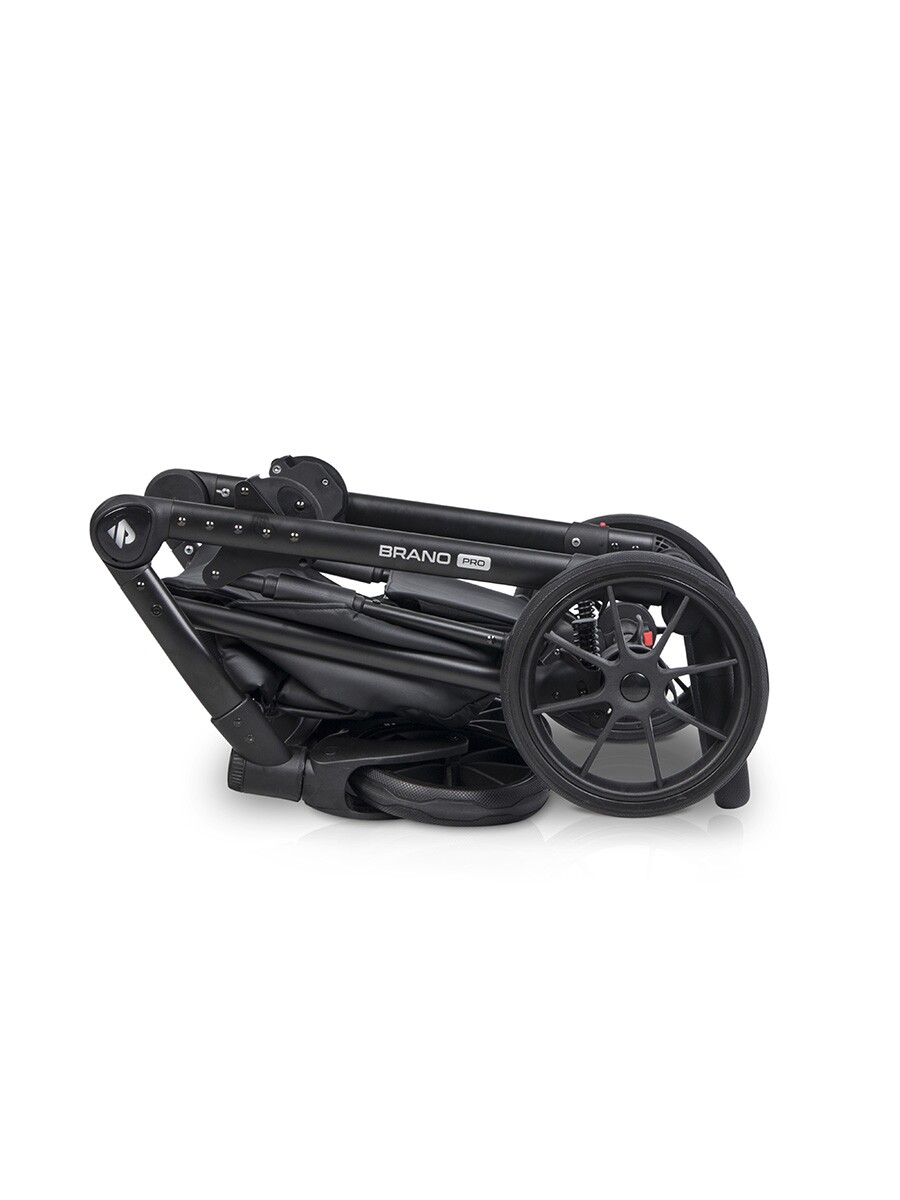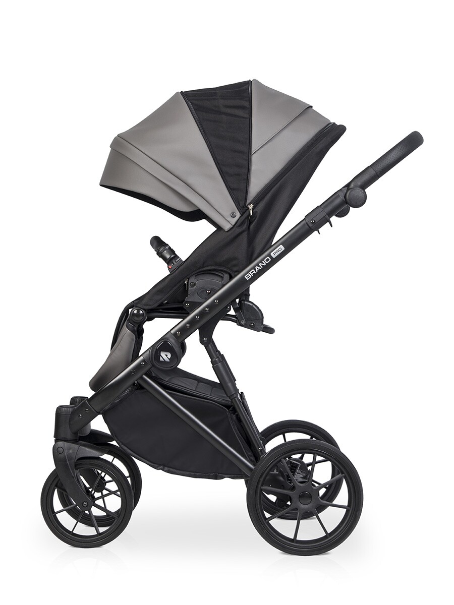 Отличительной чертой колясок серии Brano является безаварийность и исключительная прочность, благодаря которым Brano Pro наверняка послужит более чем одному ребенку. Последняя коллекция Riko Brano Pro оснащена обивкой из модной и грязеотталкивающей эко кожи в сочетании с черными тканевыми элементами. Завершает образ черная рама с серебряными принтами.