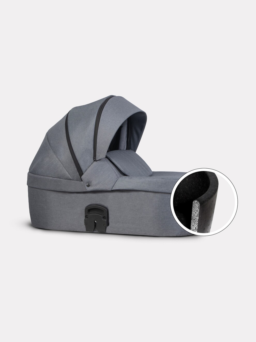 Уникальность люльки заключается в современном материале Piocelan с высоким термическим сопротивлением. Такая люлька очень легкая и даже миниатюрная мама без труда сможет снять люльку с шасси и занести домой со спящим ребенком. Зимой люлька сохраняет тепло внутри коляски, а летом, наоборот, не нагревается, поддерживая комфортную температуру для малыша. В сочетании с качественной обивкой, которая надежно защитит от любых осадков и ветра, получается надежная всесезонная коляска.