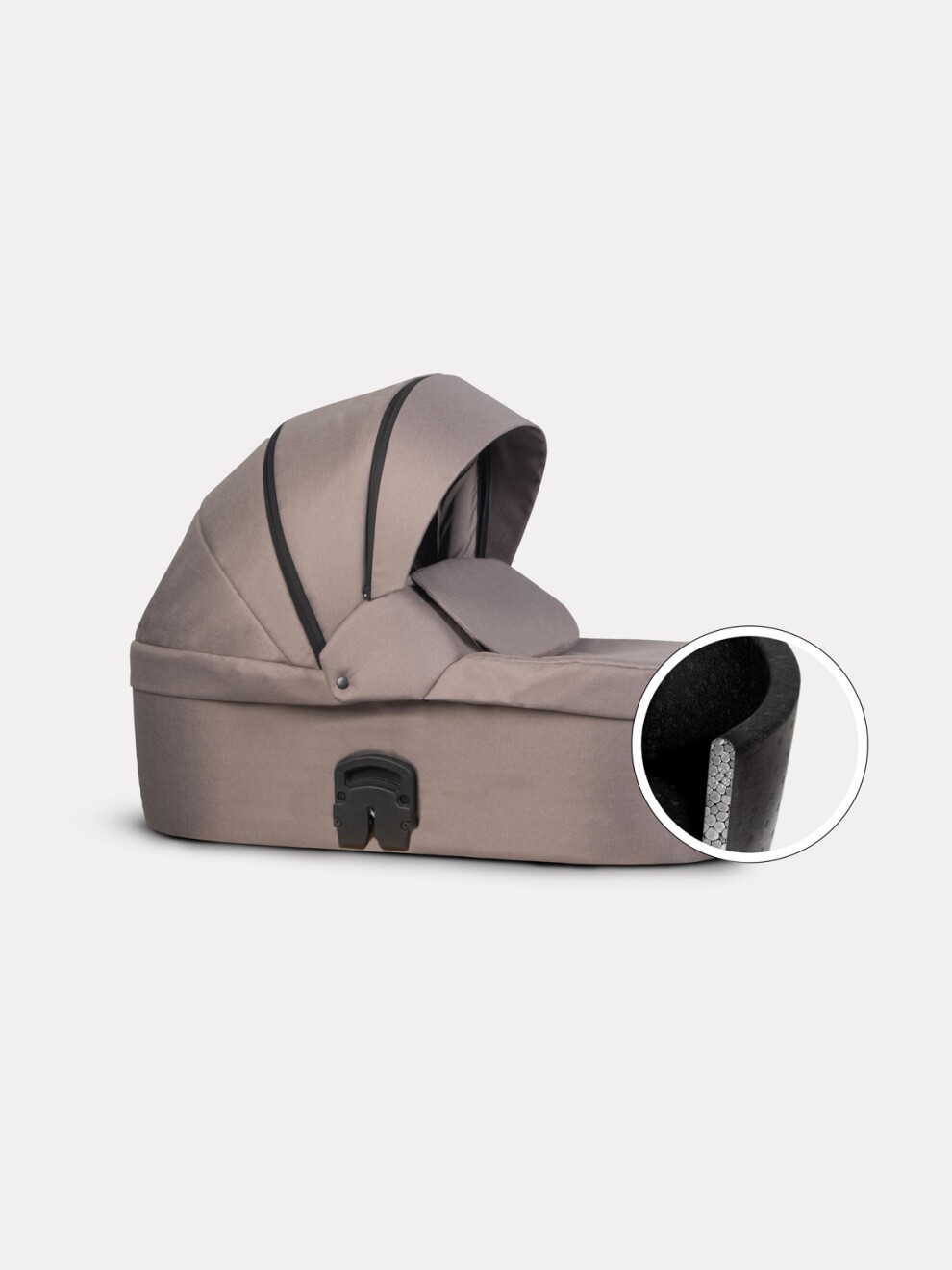 Уникальность люльки заключается в современном материале Piocelan с высоким термическим сопротивлением. Такая люлька очень легкая и даже миниатюрная мама без труда сможет снять люльку с шасси и занести домой со спящим ребенком. Зимой люлька сохраняет тепло внутри коляски, а летом, наоборот, не нагревается, поддерживая комфортную температуру для малыша. В сочетании с качественной обивкой, которая надежно защитит от любых осадков и ветра, получается надежная всесезонная коляска.
